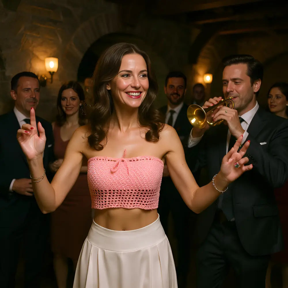 This pink top is distinguished by its openwork mesh design with a tighter stitch at the top, its bustier neckline, and its cropped cut, which lend it a light and feminine feel. Perfect for adding style and romance to your summer outfits, it's equally suited to festive events, country outings, elegant receptions, or relaxing moments in a library.